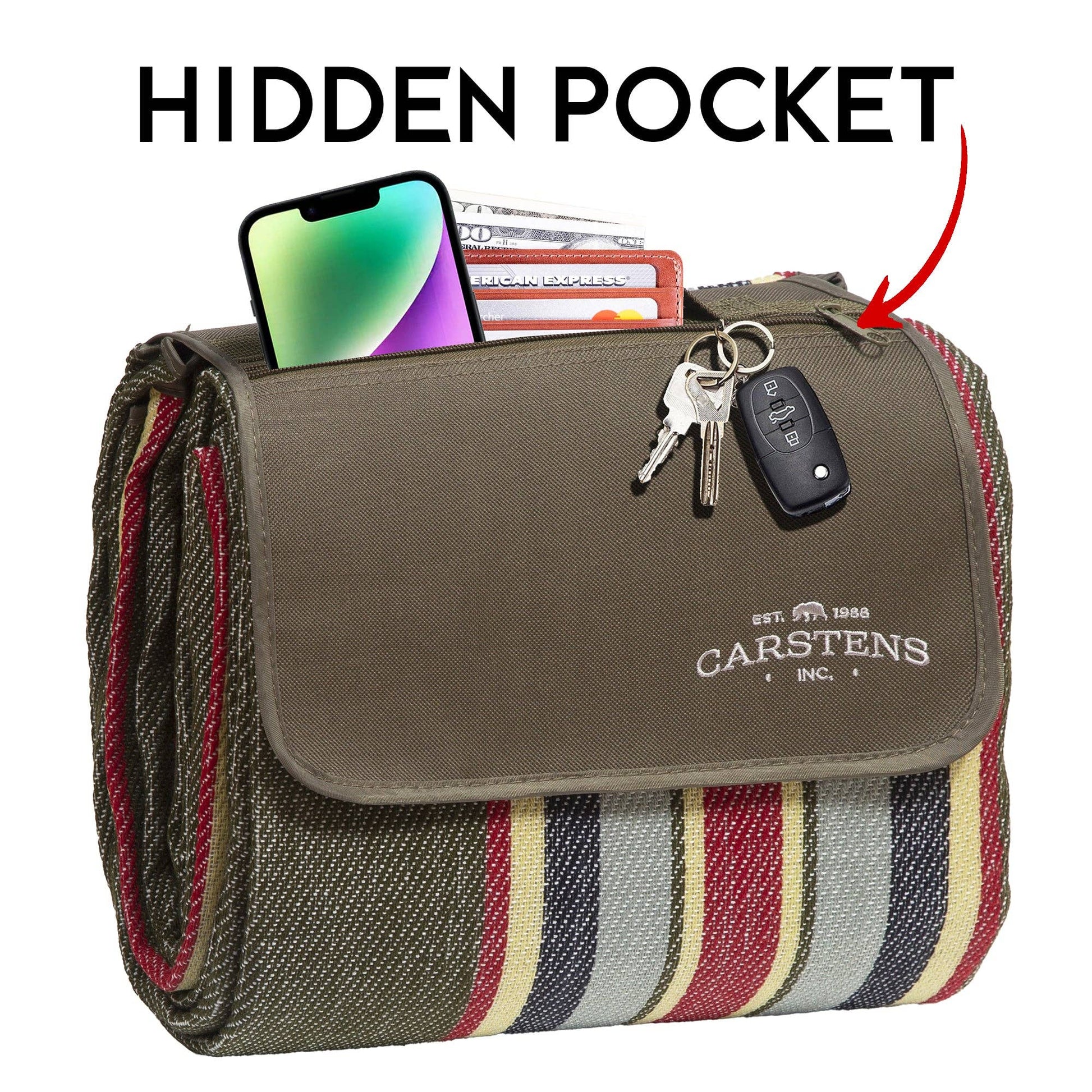 140 GSM woven blanket with a waterproof pvc backing and a zipper pocket on the flap