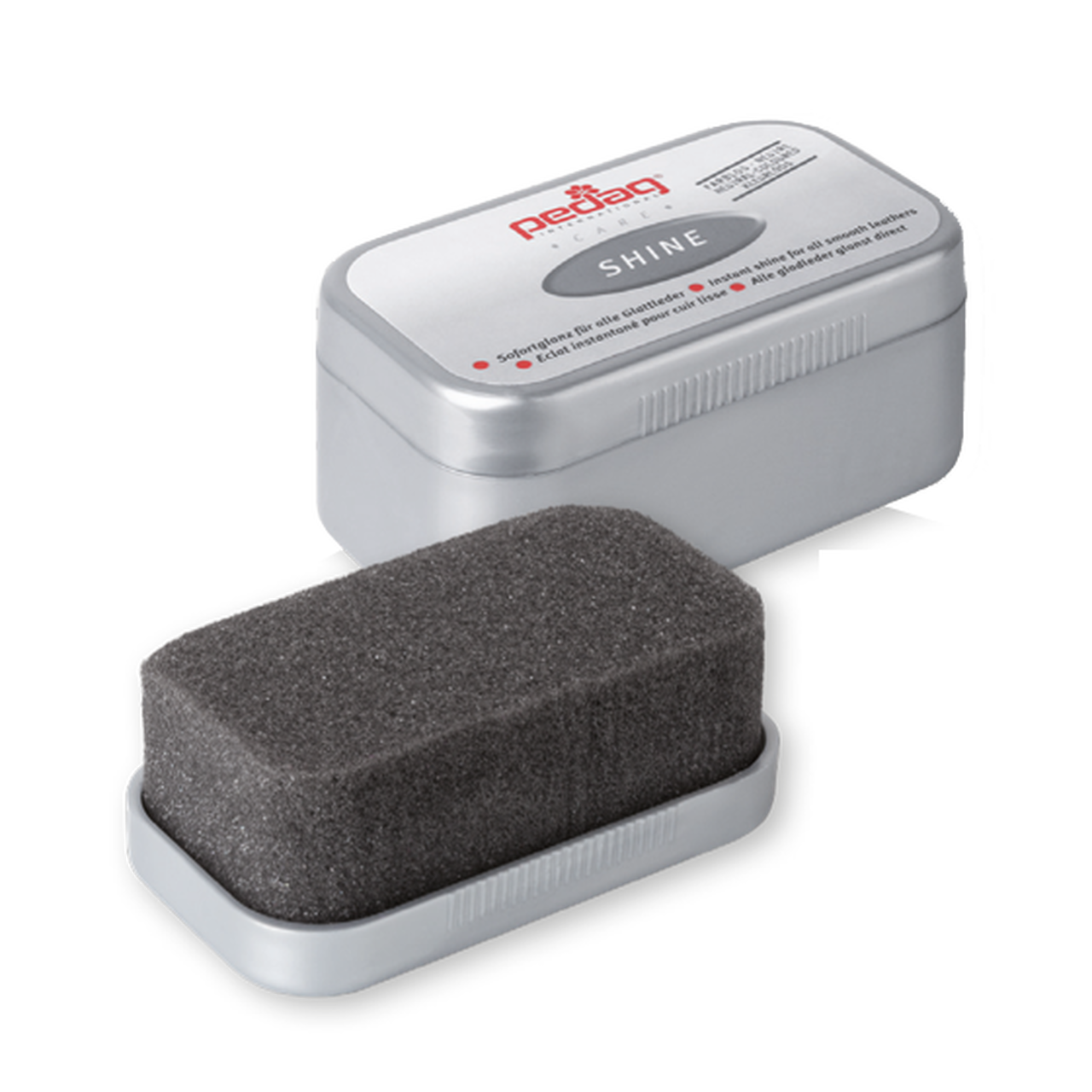 Pedag® Shine is a silky, premium wax soaked sponge in a plastic box. The sponge gives an instant shine to all smooth leathers, synthetic and imitation leathers. Shine is ideal for boots and shoes but also be used for car interiors, handbags, furniture, belts, etc. The top of the plastic container functions as a handle for ease of use. Very easy, quick "on the go" shine without any mess. Weighs only 2.1 ounces-great for traveling.